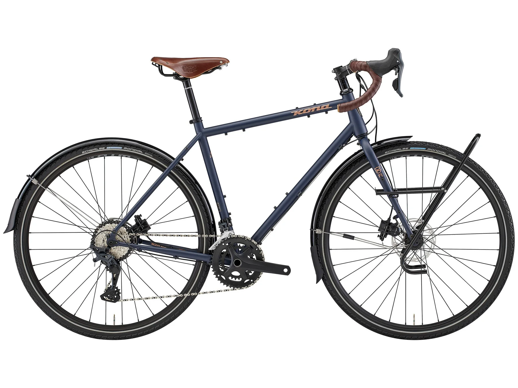 Le Kona Sutra arrive prêt à rouler, sans compromis. Selle Brooks, ruban de cintre assorti, leviers de vitesses et de frein intégrés, garde-boue efficaces et véritable porte-bagages avant Tubus Tara Big Apple : chaque composant est choisi pour sa fiabilité et sa pertinence en voyage. Rien n’est superflu, tout est pensé pour transporter, rouler longtemps et rester confortable, quelles que soient les conditions.